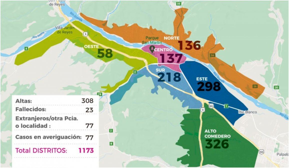 - En el mapa de contagios, Alto Comedero concentra la mayor cantidad con 326 infectados.