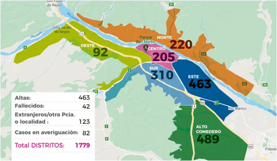 - En el mapa de contagios, Alto Comedero concentra la mayor cantidad con 489 infectados.