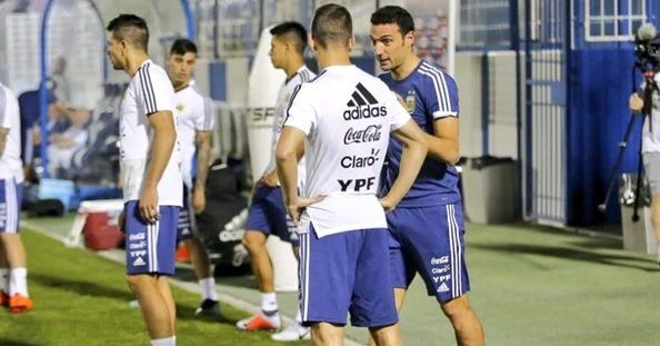 Después de varios inconvenientes entre bajas y problemas de visas que retrasaron la llegada de varios jugadores, Lionel Scaloni pudo realizar el primer entrenamiento en un campo de juego, donde empezó a probar el equipo para enfrentar este jueves a Irak.