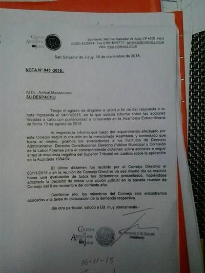 Mediante una nota firmada, el titular de la Asociación de Abogados de Jujuy, Aníbal Masaccessi, había solicitado al Colegio de Abogados que se le informara acerca de las acciones llevadas a cabo con posterioridad a lo resuelto en la Asamblea extraordinaria del pasado 13 de agosto, donde se había consultado a todos los afiliados del Colegio de Abogados acerca de la pertinencia o no de la aplicación de la acordada 1994 y las acciones a seguir de allí en adelante.