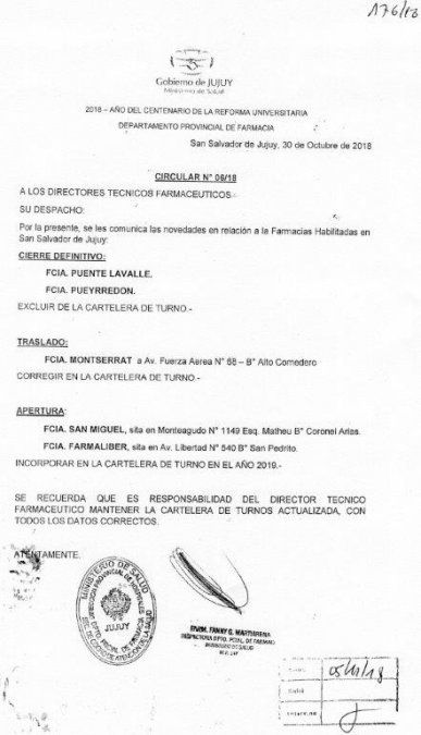 El Departamento Provincial de Farmacia del Ministerio de Salud, a través de la circular N° 06/18, dio novedades con relación a las farmacias habilitadas en San Salvador de Jujuy.
