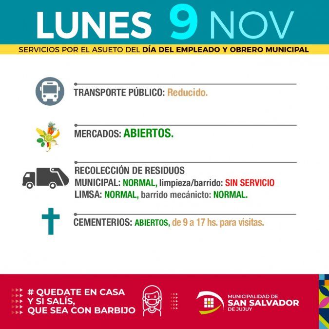 Además, la dirección de Tránsito y Transporte, dependiente de la secretaría de Servicios Públicos, informó que el servicio de transporte urbano de pasajeros será de manera reducida, en un 30% en horarios pico y en horas valle funciona al 20%.