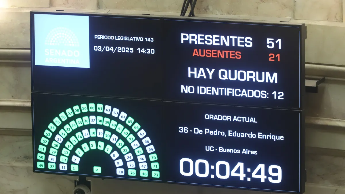 Es por eso que fueron decisivas las presencias de los macristas Alfredo De Ángeli y María Victoria Huala, además de los radicales Pablo Blanco y Martín Lousteau, así como también el exoficialista Francisco Paoltroni. Cuando el tablero marcó 38 presentes -uno más del quórum reglamentario- bajaron el resto de las bancadas. Entre ellos, los libertarios, el resto de la UCR y el Frente PRO, Provincias Unidas y otros.
