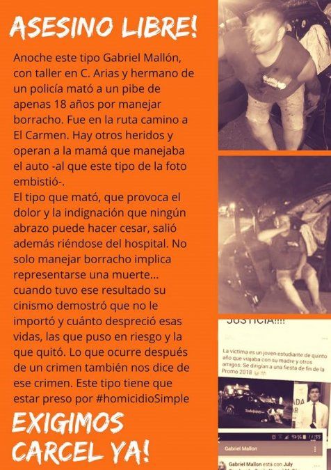 Se trata de Gabriel Mallón, quien en las primeras horas del sábado venía por Ruta 9 desde la ciudad de El Carmen , se cruzó de carril e impactó de frente contra un auto en el que iban una madre, su hijo Facundo y cinco estudiantes del Colegio El Salvador.