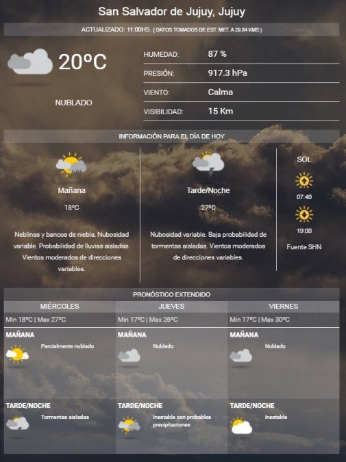 Si bien cesó el alerta por tormentas fuertes en el Este de Jujuy, para la tarde se han pronosticado lluvias aisladas y en la noche tormentas aisladas con vientos moderados en direcciones variables.