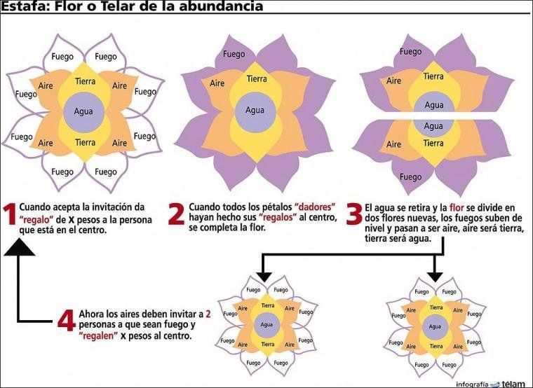 La estafa, que en febrero de 2016 comenzó a diseminarse en Mendoza y hace unos meses llegó a la Ciudad de Buenos Aires, se reproduce de boca en boca entre conocidos, ya que la confianza es central para la conformación de la estructura que se presenta como una flor.