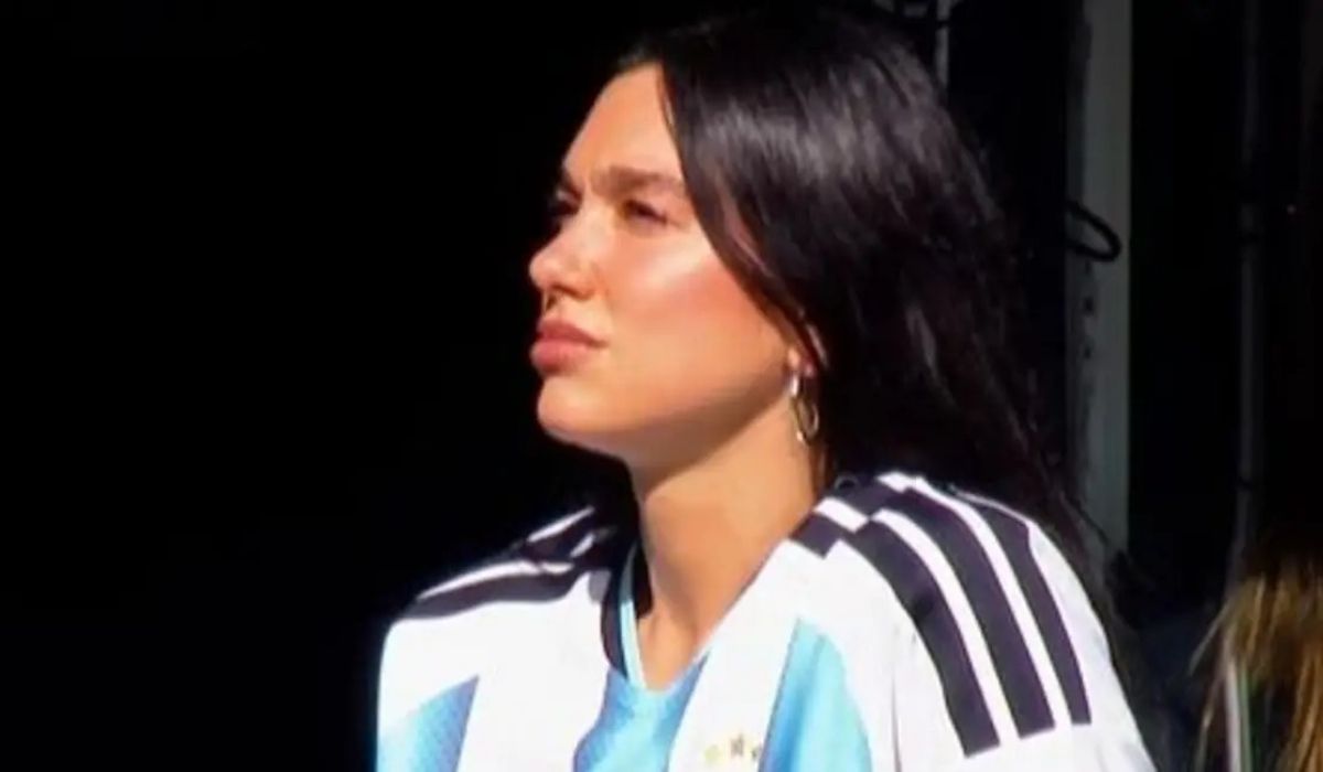 Vestida con la camiseta de la Selección Argentina, Dua Lipa notó que la estaban filmando, sonrió y realizó un sutil movimiento de hombros, "bailando" brevemente al compás del ambiente mientras se acomodaba el cabello.