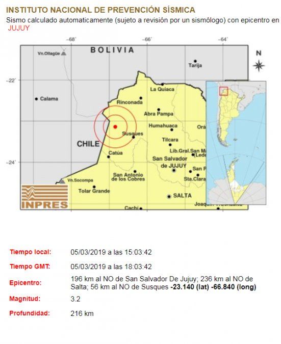 Pasadas las 15:00 se registró un movimiento sísmico en la localidad de Susques, a 196km de San Salvador.