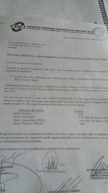 El pasado 28 de abril ingresaron al Concejo Deliberante una nota, dirigida a los concejales, cuyo contenido resume el estudio de costos privado que ellos mismos realizaron.