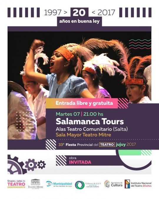 22:00 Hs.: “SALAMANCA TOURS”. Grupo Alas Teatro Comunitario (SALTA). Sala Mayor del Teatro Mitre (Alvear 1009). Comedia para toda la familia. Obra Invitada. ENTRADA LIBRE Y GRATUITA.