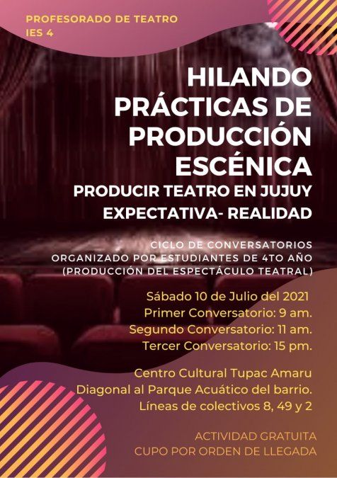 La actividad es libre y gratuita por orden de llegada y cupo limitado. También se transmitirá en vivo por el facebook “Comunidad del Profesorado de Teatro Jujuy”.