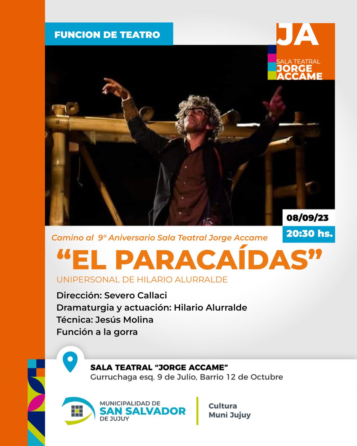 En el marco de los festejos por el 9no Aniversario de la Sala Teatral Jorge Accame, se repone una función de la obra teatral "El Paracaídas", con entrada a la gorra.