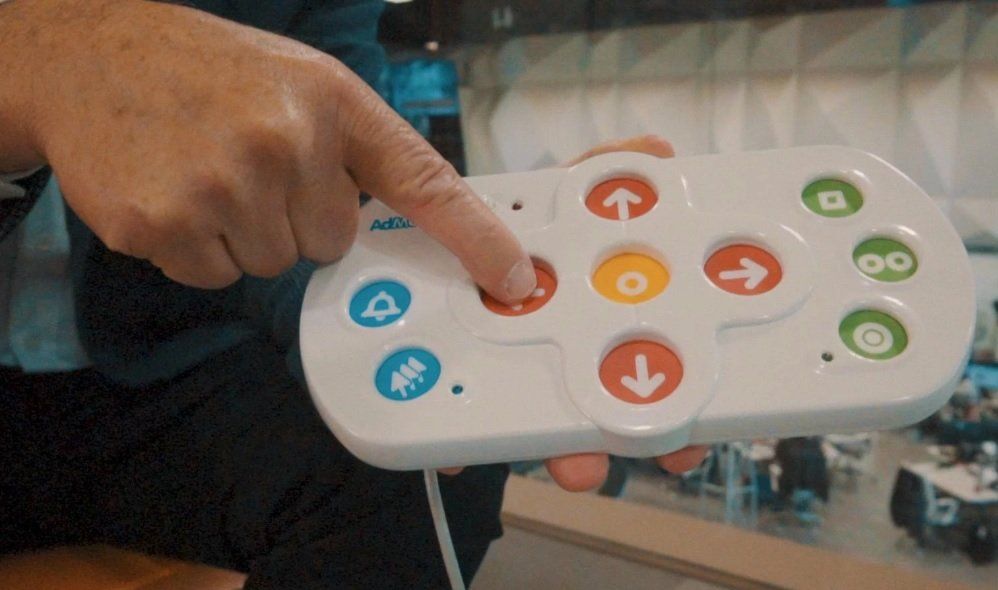 Después de varios años de desarrollo presentaron AdMouse, un aparato que parece un joystick y que permite usar la computadora o el teléfono moviendo el puntero del mouse con los botones.