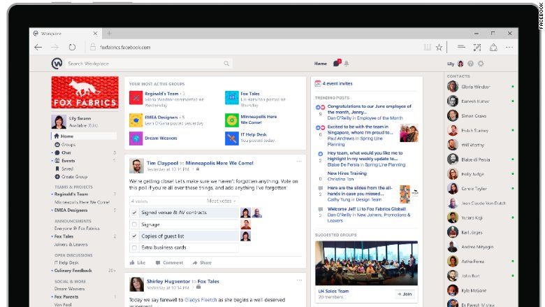 Workplace se ve y se siente como Facebook, incluyendo las noticias, los grupos y las historias del momento, pero se enfoca específicamente en tu compañía. Los empleados pueden usarlo como un boletín en línea para seguir los anuncios de la empresa y los eventos. También pueden organizar grupos de Facebook dentro de la compañía o con otras empresas con las que hacen negocios. Las opciones son enviar mensajes o llamar a los compañeros de trabajo e incluso ver transmisiones en vivo de sesiones con ejecutivos.
