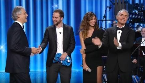 La RAI, uno de los principales canales de TV de Italia, repitió un programa en donde se encontraron el tenor, Andrea Bocelli e Higuaín. Allí se puede ver que después de una conversación entre ambos, el delantero argentino le extiende la mano para saludarlo y por supuesto, el cantante (no vidente) no se percata de lo ocurrido.
