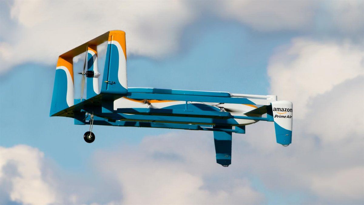 Amazon presentó una nueva versión de su drone, el prototipo combina diseño híbrido que emula las prestaciones de un helicóptero y un aeroplano para el despegue vertical y un deslizamiento horizontal a 120 metros de altura; la compañía promete una entrega de los pedidos en un tiempo estimado de 30 minutos.