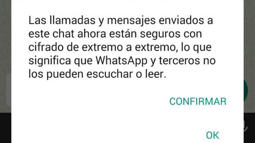 Los mensajes de WhatsApp están protegidos: "las llamadas y mensajes enviados a este chat ahora están seguros con cifrado de extremo a extremo, lo que significa que WhatsApp y terceros no los pueden escuchar o leer".