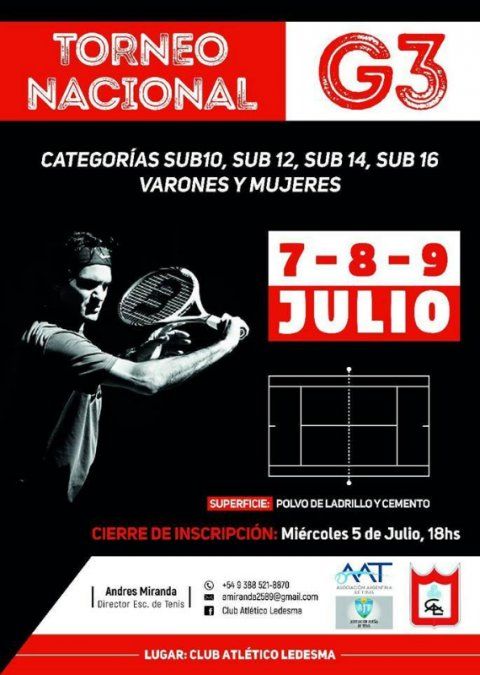 Este miércoles 5 de julio, a las 20:00 cierran las inscripciones para los tenistas interesados en jugar el Nacional de Grado 3. El torneo se jugará desde el próximo viernes en las canchas de Club Atlético Ledesma.