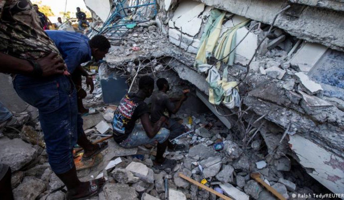 Durante la noche, con la preocupación por las réplicas, máquinas pesadas, camiones y retroexcavadoras trasladaron losas de cemento de los edificios derrumbados en la localidad de Los Cayos, cerca del epicentro del terremoto.