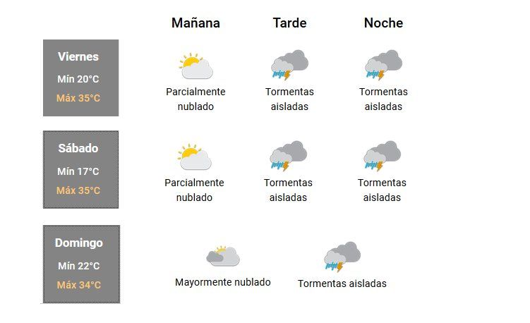 El sol llegó para quedarse, al menos por estos días. Para este viernes rige una mínima de 20ºC y una máxima de 35ºC, aunque con probabilidad de tormentas aisladas hacia la tarde noche.