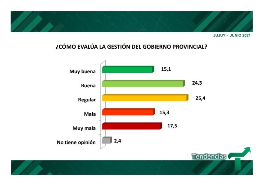 En cuanto a cómo evalúan la gestión del gobierno provincial, un 15,1 % señaló que es muy buena y un 17,5 % muy mala.