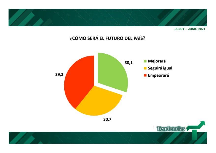 Continuando con los datos de la Consultora Tendencias un 39,2 % considera que la situación del país empeorará; un 30,7 % considera que seguirá todo igual y el 30,1 % cree que mejorará.