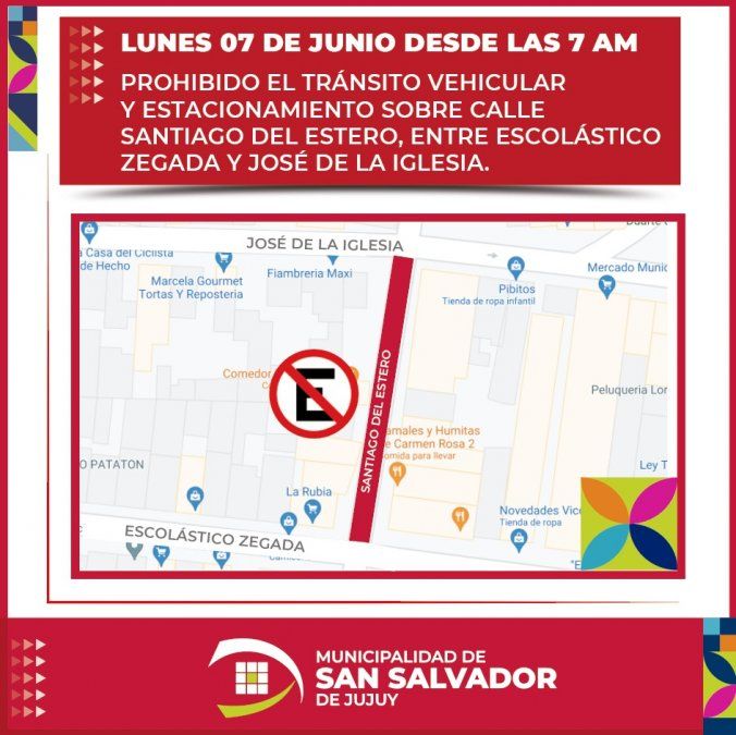 El municipio capitalino informó a la población en general que, a partir del lunes 7 de Junio se procederá a inhabilitar el tránsito vehicular y estacionamiento sobre calle Santiago del Estero, entre Escolástico Zegada y José de la Iglesia.