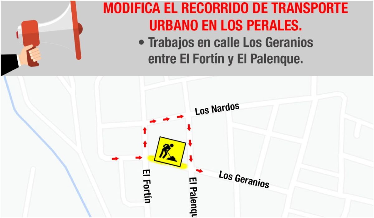 La Dirección de Tránsito y Transporte, informa a la población en general y a los señores conductores en particular, que a causa de los trabajos de pavimentación en calle Los Geranios entre El Fortín y El Palenque del barrio Los Perales, a partir de este lunes 21, y mientras dure la obra se dispuso modificar el recorrido del transporte urbano de pasajeros siendo el recorrido habitual, Los Nardos, EL Palenque, Los Geranios y nuevamente recorrido habitual.