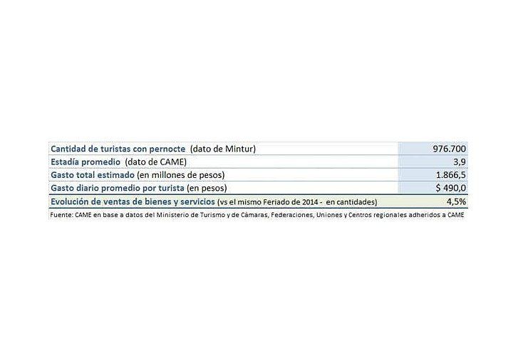 Según el relevamiento de ventas realizado por CAME en 40 ciudades del país, los comercios vinculados al turismo de las ciudades receptivas reportaron, en promedio, un aumento de 4,5% en las ventas (en cantidades) frente al mismo fin de semana de 2014. Aunque el aumento se debe a la mayor cantidad de gente que viajó y a que este año hubo 4 días de mini vacaciones. Para aprovechar el público, muchos comercios se mantuvieron abiertos los 4 días.