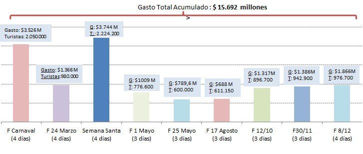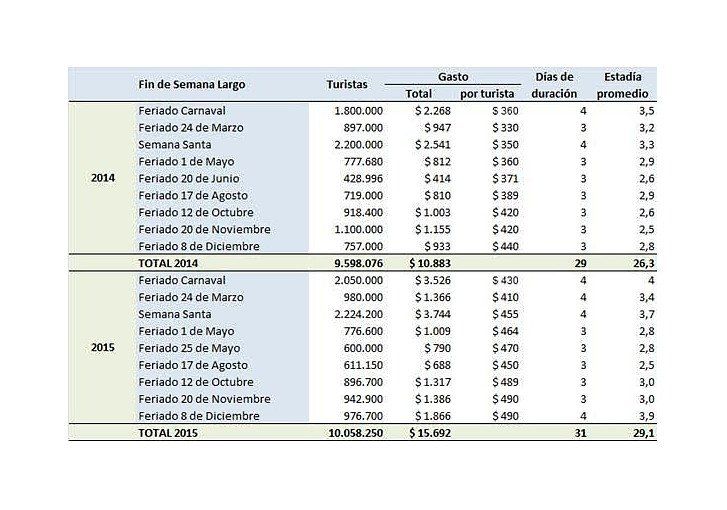 En lo que va de 2015, ya hubo 9 fines de semanas largos (Carnaval, Día de la Memoria y Justicia, Semana Santa, Día del Trabajador, Día de la Bandera, San Martín, Diversidad Cultural, Soberanía Nacional e Inmaculada Concepción) donde viajaron 10,1 millones de turistas con pernocte, y generaron un movimiento económico directo de 15.692 millones de epsos en las regiones.