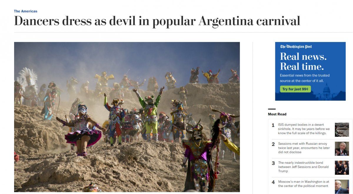 El carnaval jujeño, específicamente la tradicional bajada de los diablos en la localidad de Uquía quedó plasmado en el conocido diario de Washington, EEUU, quien tituló “ Bailarines vestidos como diablos en el carnaval popular argentino”.