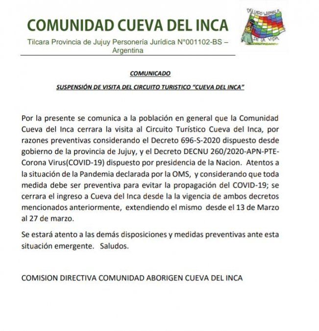 Diferentes lugares buscan “blindarse” a fin de evitar un posible contagio de coronavirus y deciden cerrar provisoriamente sus puertas al turismo. Así lo decidió Iruya el jueves y ahora también la Comunidad de Cueva del Inca de Tilcara.
