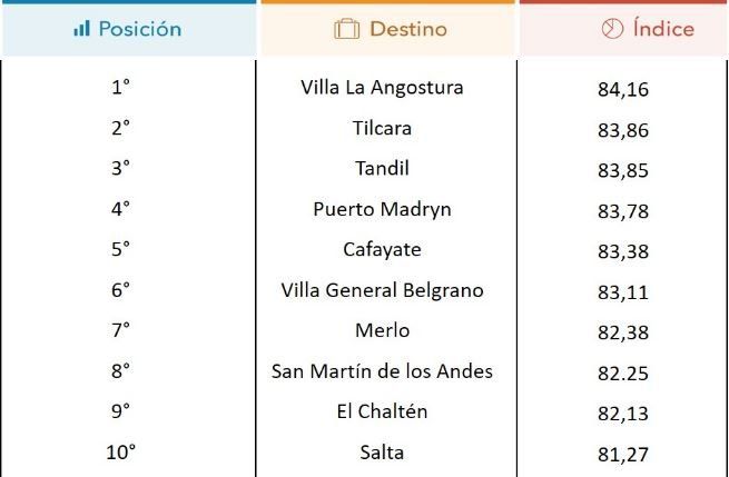 Villa La Angostura ocupa el primer lugar del Top Ten, seguida de cerca por Tilcara. Tandil ingresa en el podio en lugar de Puerto Madryn, que este año ocupa la cuarta posición. El quinto y el sexto escalón son ocupados por Cafayate y Villa General Belgrano, respectivamente. El séptimo lugar es para Merlo, por encima de San Martin de los Andes. El Chaltén se ubica en el noveno lugar y Salta cierra la clasificación.