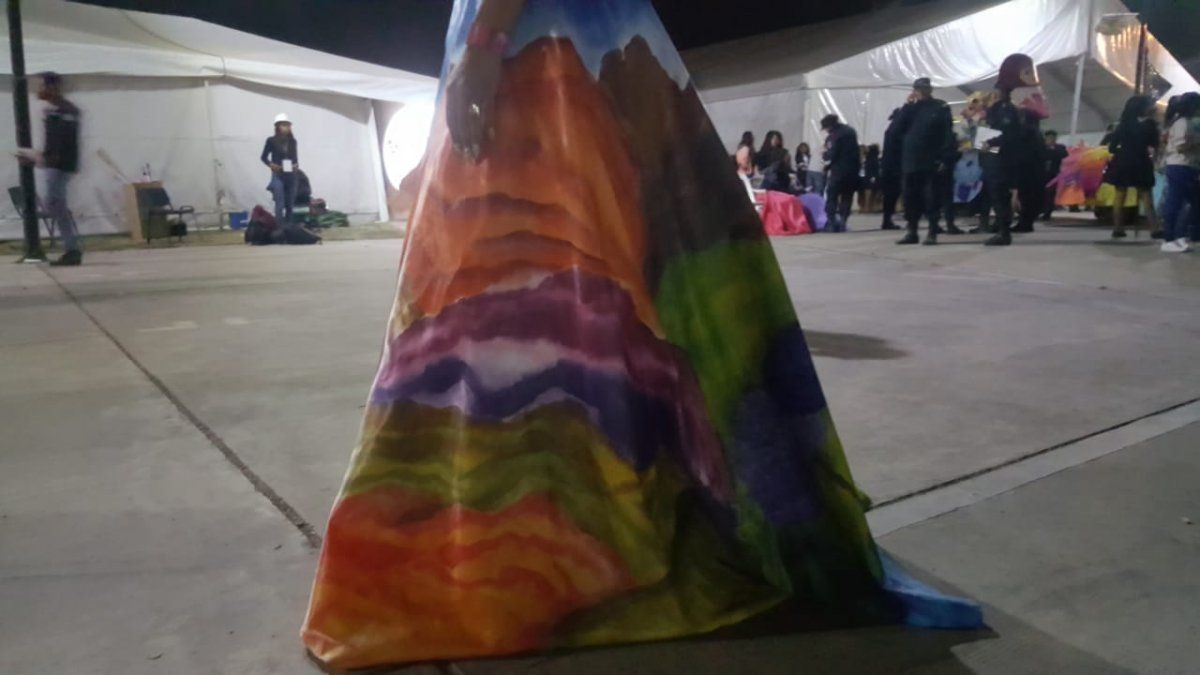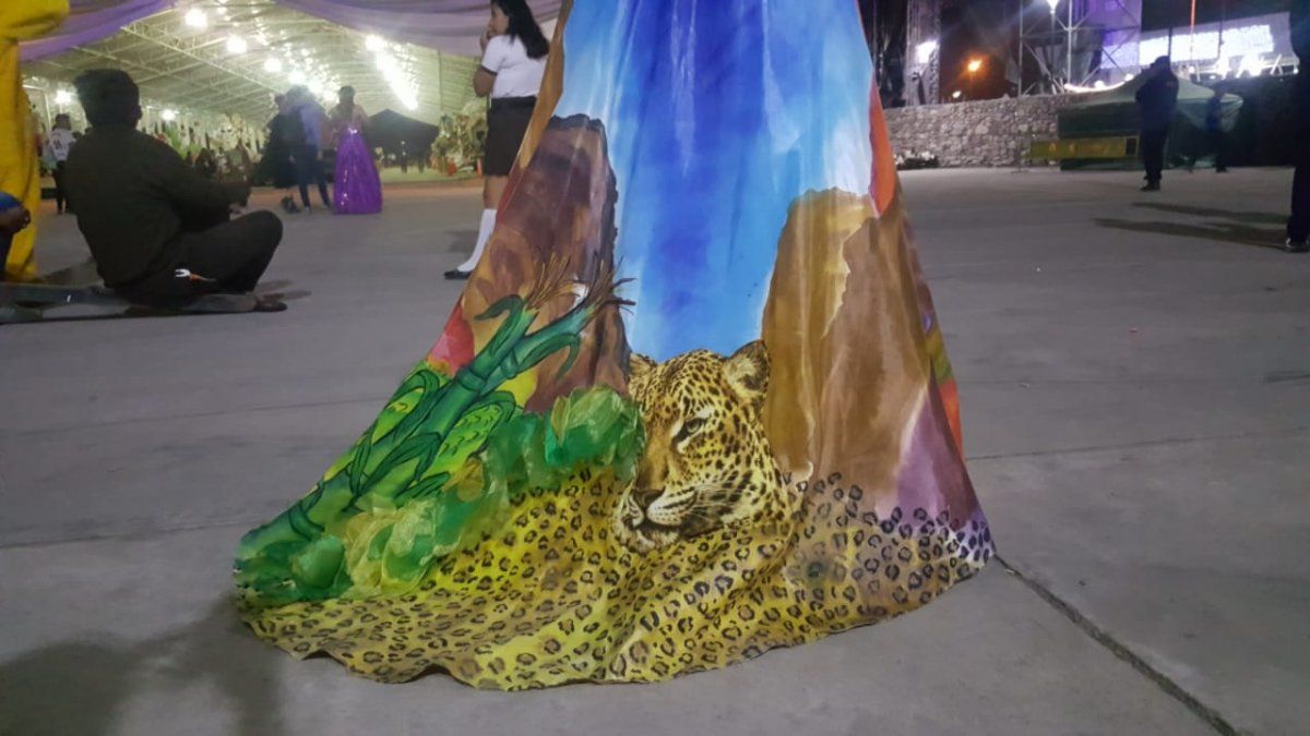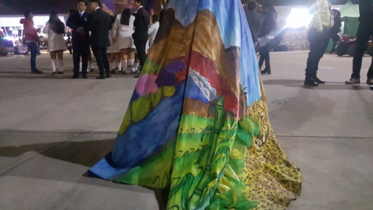 Llamó la atención del público su original vestido. El diseño lleva estampadas características particulares de las cuatro regiones de Jujuy: Puna, Quebrada, Valles y Yungas.