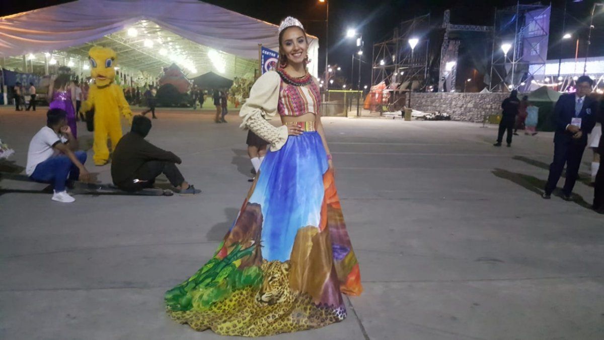 La reina del Polivalente de Artes de San Pedro sorprendió con su diseño que incluye las cuatro regiones de la provincia estampadas.