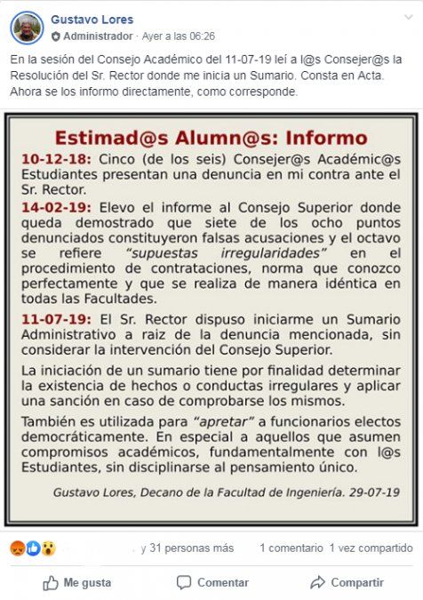 Allí es donde puso el foco Lores –que integra el Consejo Superior de la UNJU como autoridad de Ingeniería- e hizo pública la situación que atraviesa. En un comunicado emitido por el Decano dirigido a toda la comunidad universitaria, informa de manera cronológica los hechos acontecidos hasta encontrarse actualmente sumariado.