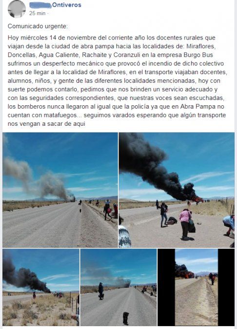 La noticia se conoció pasado este mediodía. Un colectivo que salió desde la localidad de Abra Pampa hacia las localidades de Miraflores, Doncellas, Aguas Calientes, Rachaite y Coranzulí, tuvo un desperfecto mecánico que desencadenó un feroz incendio.
