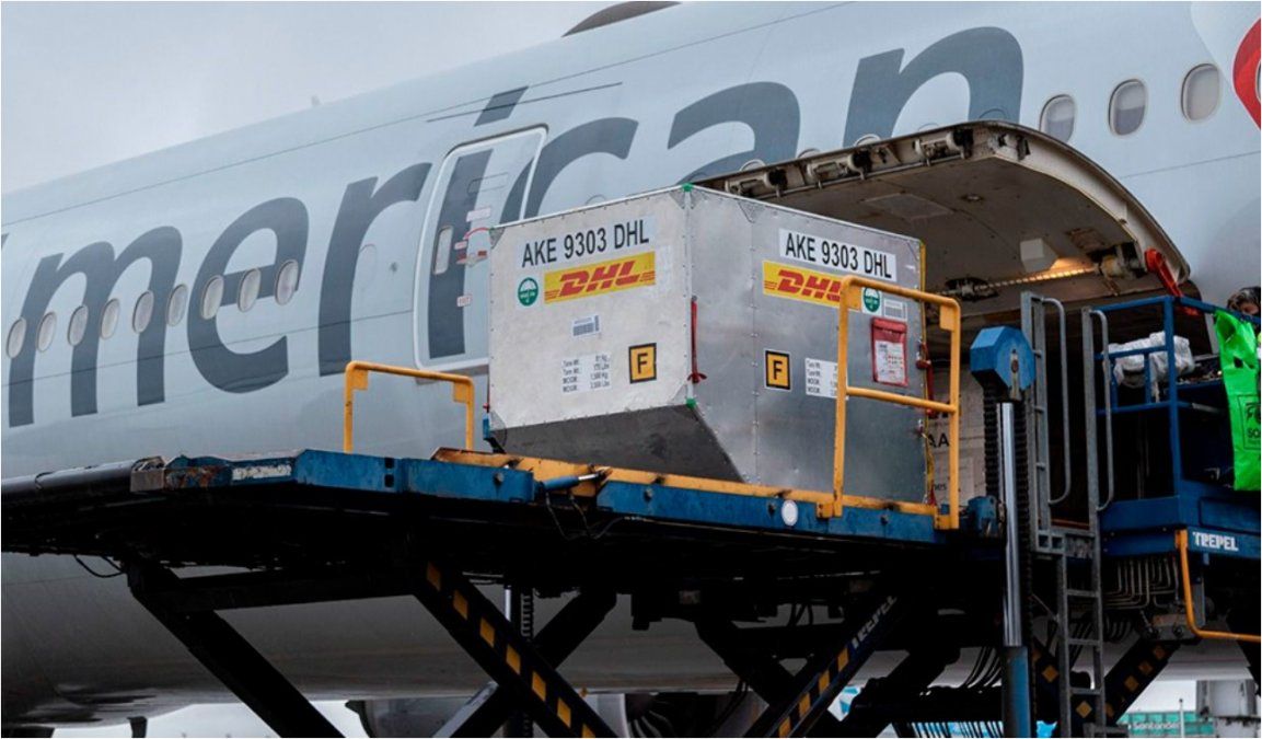 El cargamento con las primeras 100.620 dosis de vacunas de Pfizer arribó a las 15.11 al Aeropuerto Internacional de Ezeiza, en el vuelo AA991 de American Airlines.