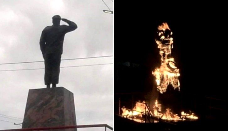 Euforia por el incendio a la estatua de Hugo Chávez en medio de las protestas