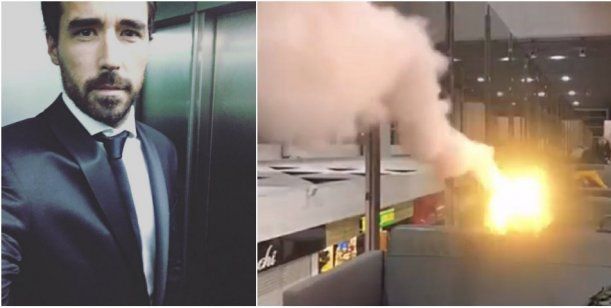 En la grabación hecha con su celular se puede ver la sala de embarque de un aeropuerto, donde el productor espera por su avión de regreso luego de su viaje, cuando de repente cae lo que parecería ser una bomba.