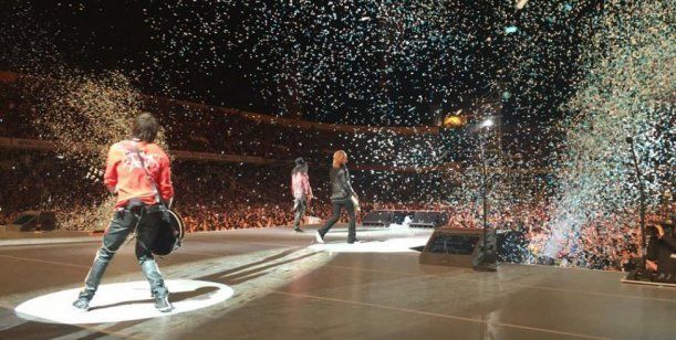 Después de una falsa despedida, volvieron para tres bises, coronando el show con "Paradise City".