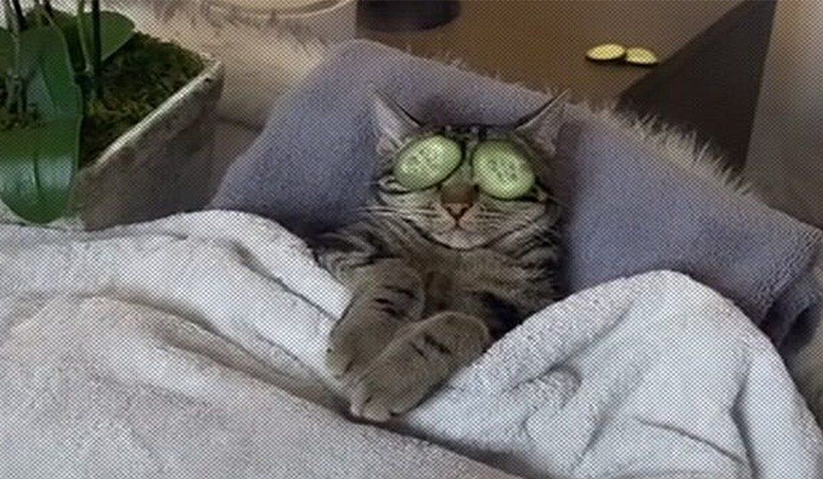 La mujer osó molestar a su gato mientras el minino estaba acostado en la cama, cubierto con una manta y recostado sobre una almohada con rodajas de pepino en los ojos y música de fondo, tal como suelen hacer los seres humanos cuando concurren a un spa.
