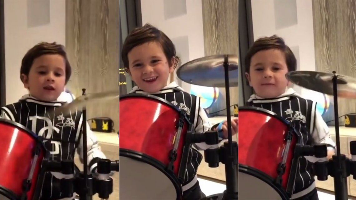 "Rock and Roll, baby", posteó la mujer de Lionel en su cuenta de Instagram para acompañar el video en el que se ve al pequeño con el instrumento de percusión.