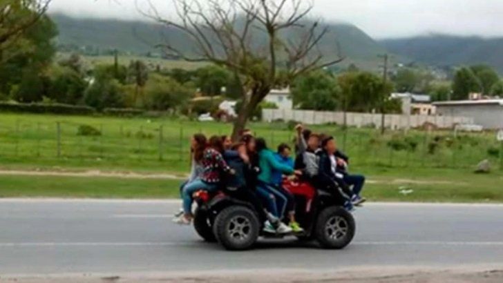 "Son más de 10 los que van arriba del cuatriciclo cuando está prohibido circular más de dos personas en este rodado. Ahí se ve la imprudencia de los menores y el descuido de los padres", comentó Adrián Maza, que sacó la fotografía.