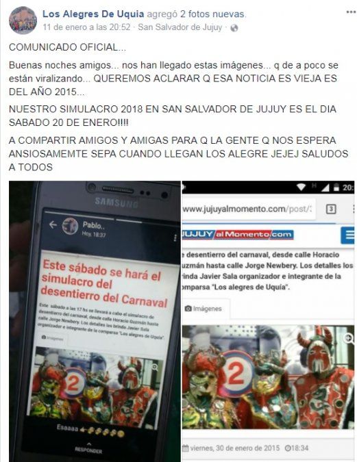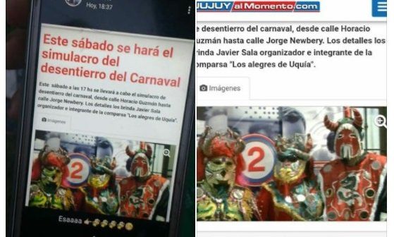 La vorágine de las redes sociales y la instantaneidad que nos permiten, hizo que algún lector de Jujuy al momento compartiera una nota del año 2015 referida a la comparsa "Los Alegres de Uquía" . La misma no tardó en hacerse viral bajo el título: "Este sábado se hará el simulacro del desentierro del Carnaval"