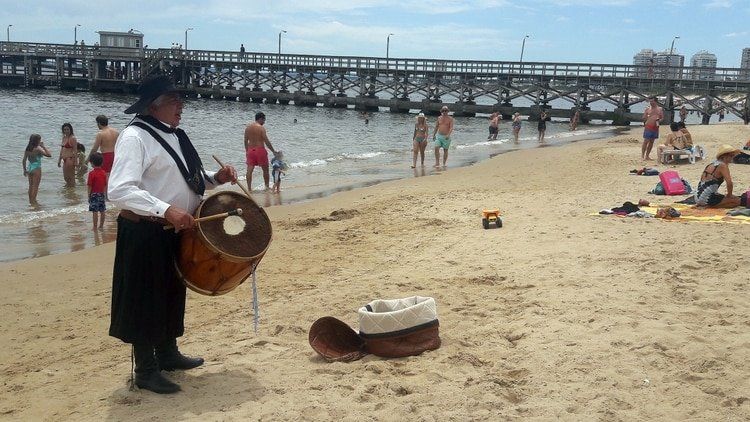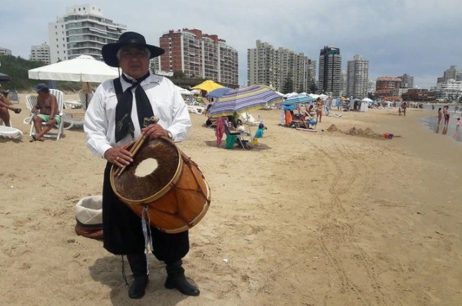 No se escucha mucha música en las playas de Punta del Este. No en las costas de la península en horas del mediodía, al menos. Bajo el agonizante rayo del sol, un hombre se anima a las botas, las medias, la bombacha de gaucho, las rastras, la camisa, el pañuelo y el sombrero, el kit completo del gaucho autóctono. Sostiene su bombo legüero, blande sus dos mazos y entona un popurrí de carnavalitos, canciones nativas del noroeste argentino.