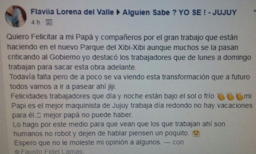 Orgullosa de la labor del “mejor maquinista del Xibi Xibi”, hizo pública su saludo de gratificación para que la opinión pública tenga en cuenta que los que trabajan son “humanos y no robots”.