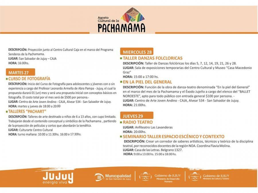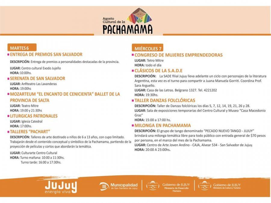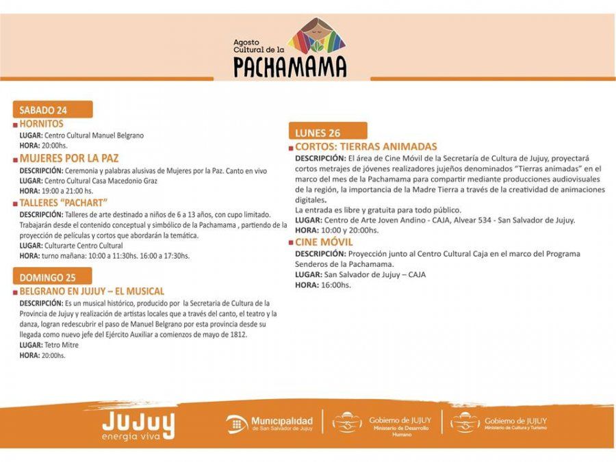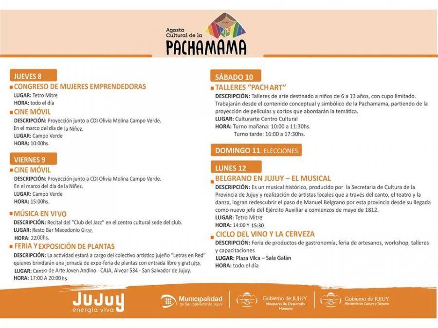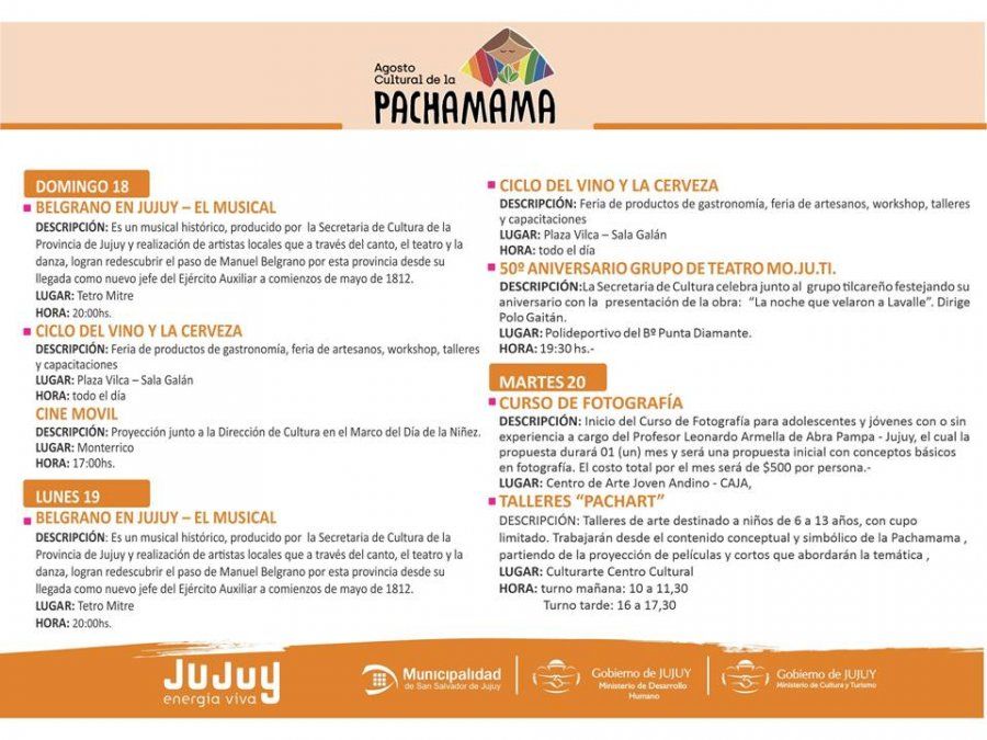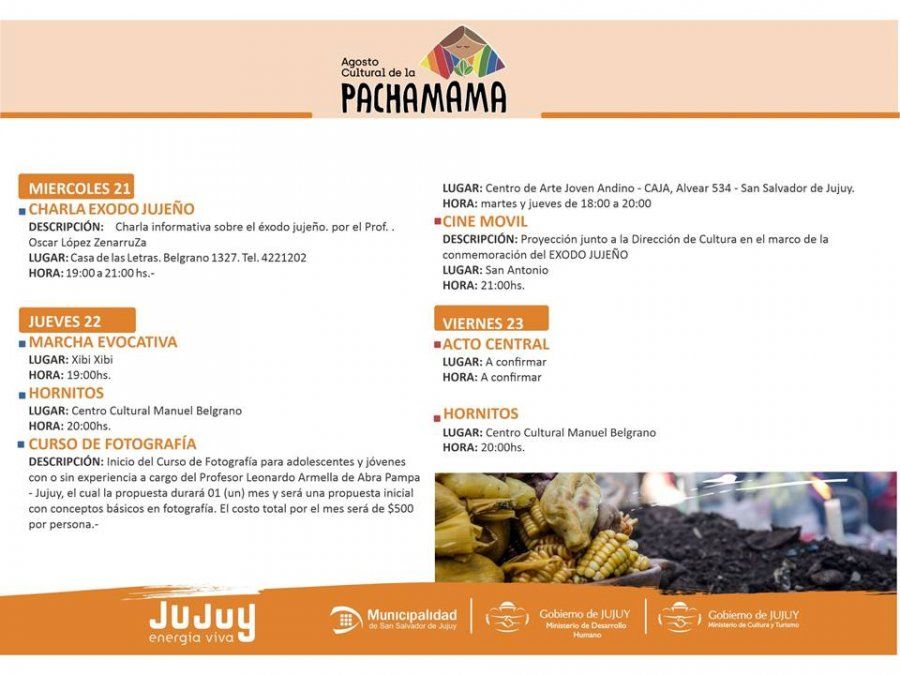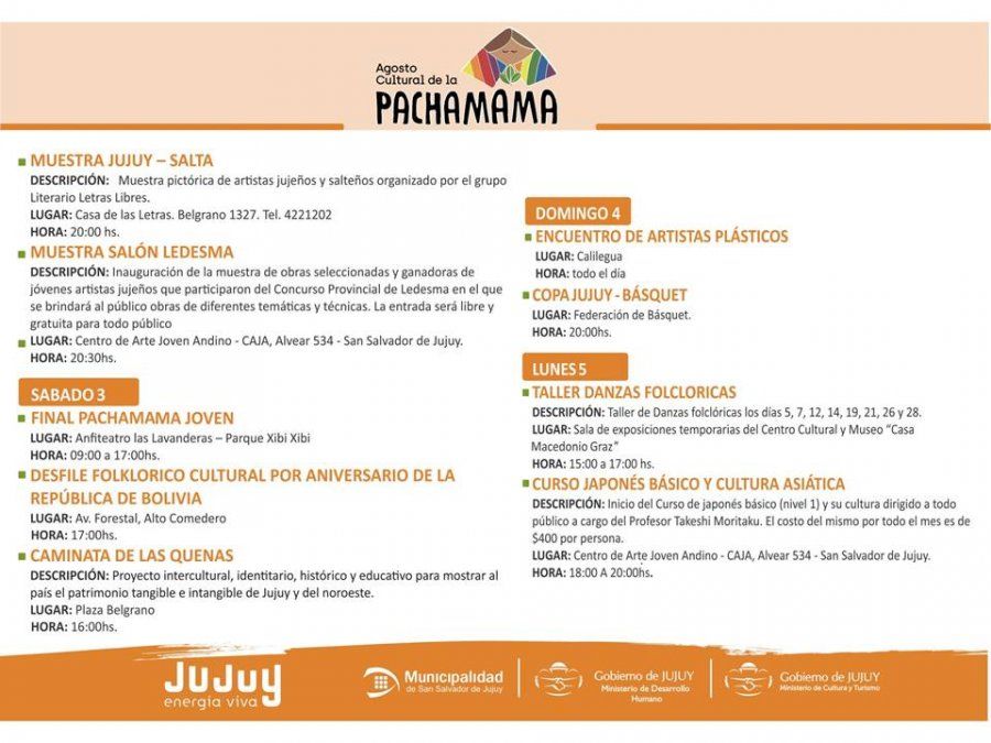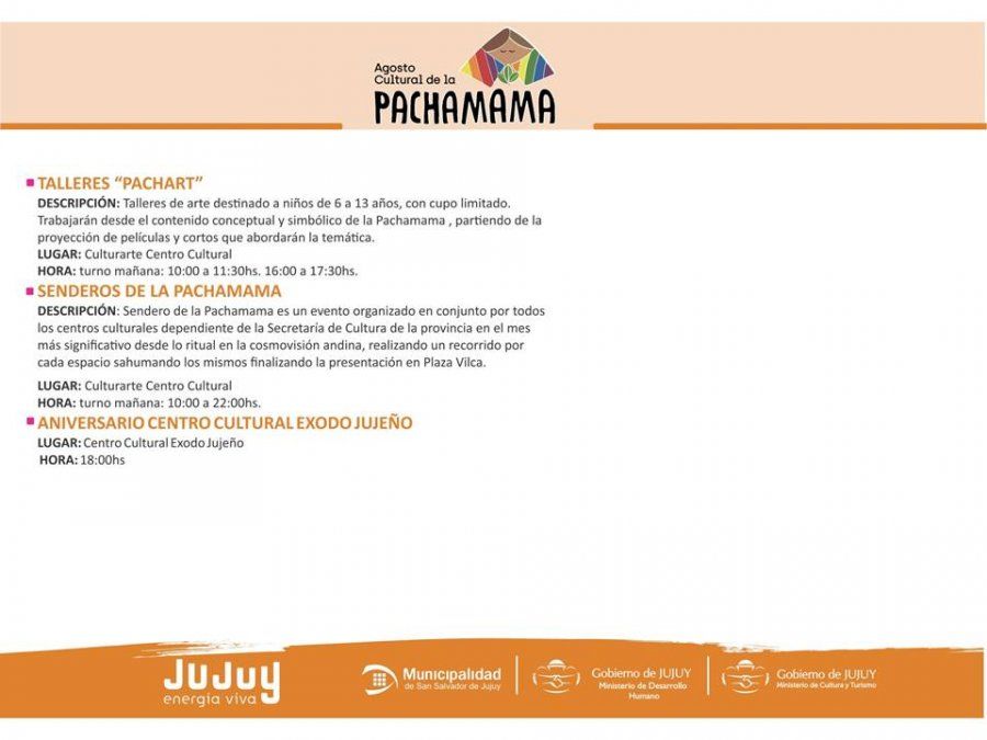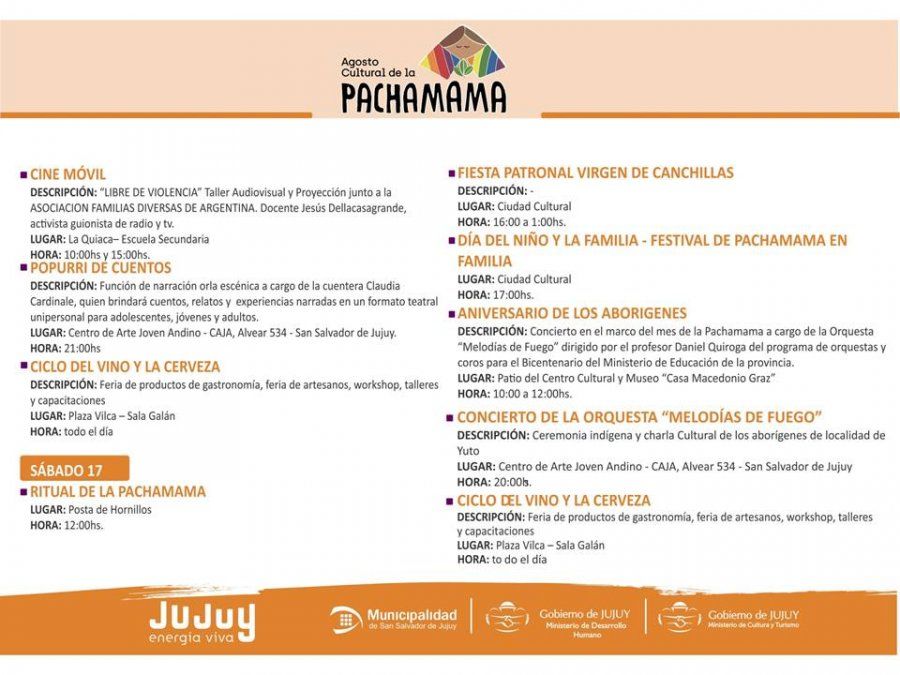 En el mes de agosto Jujuy celebra la Pachamama. En toda la provincia se le rinde culto mediante la realización de una ceremonia milenaria, en la que se dan ofrendas a la tierra, comidas, bebidas y hojas de coca. La celebración adquiere mayor relevancia en Humahuaca, Purmamarca, Tumbaya, Valle Grande y en toda la Puna jujeña.