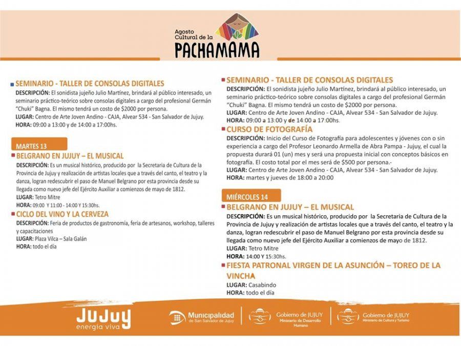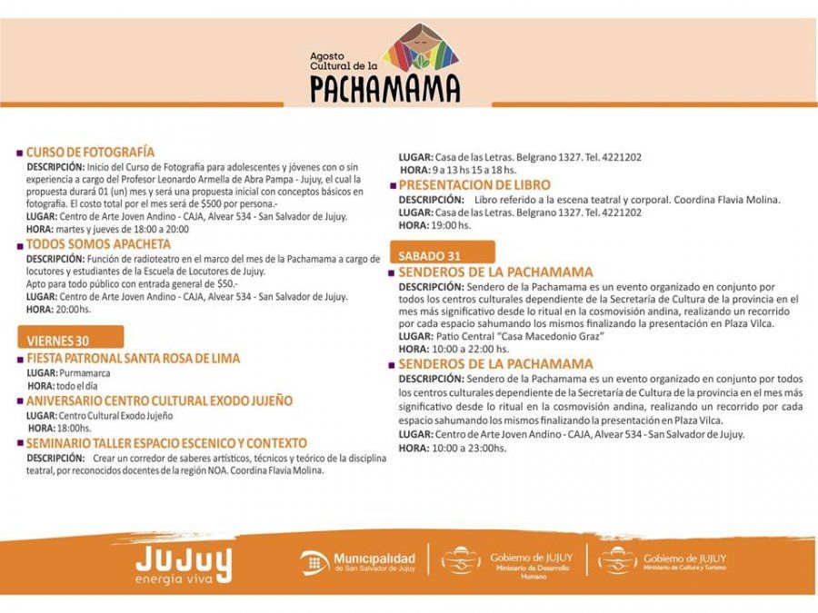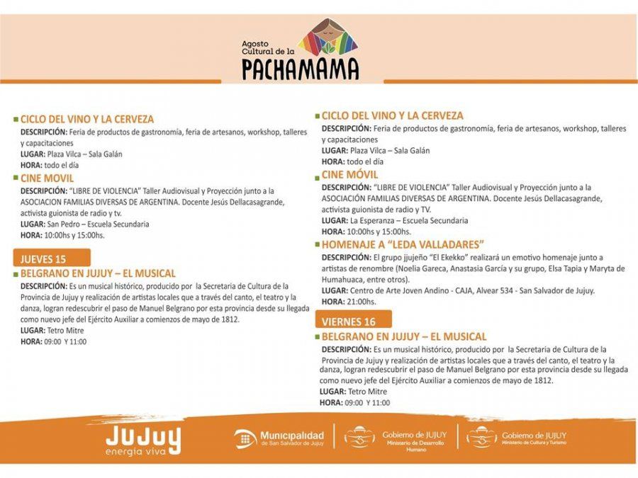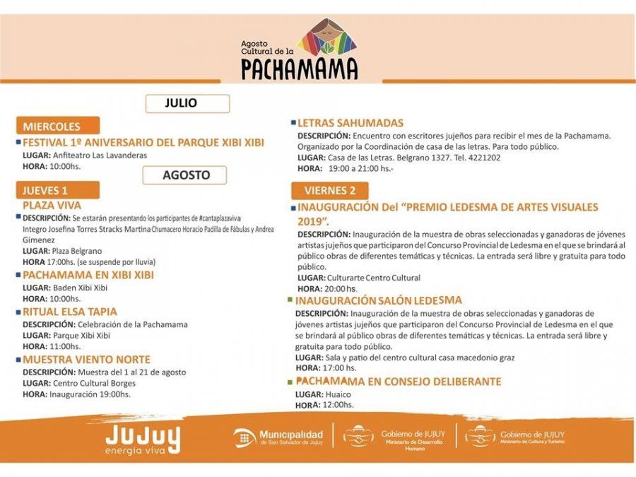 Teniendo en cuenta que desde 2013 Jujuy es capital nacional de la Pachamama, cada año se prevé un amplio programa de actividades culturales. Particularmente fue este jueves que en el Salón Blanco de Casa de Gobierno se presentó la "Agenda de Agosto Cultural”, que dará inicio el 31 de julio con las celebraciones del aniversario del Parque Xibi Xibi.