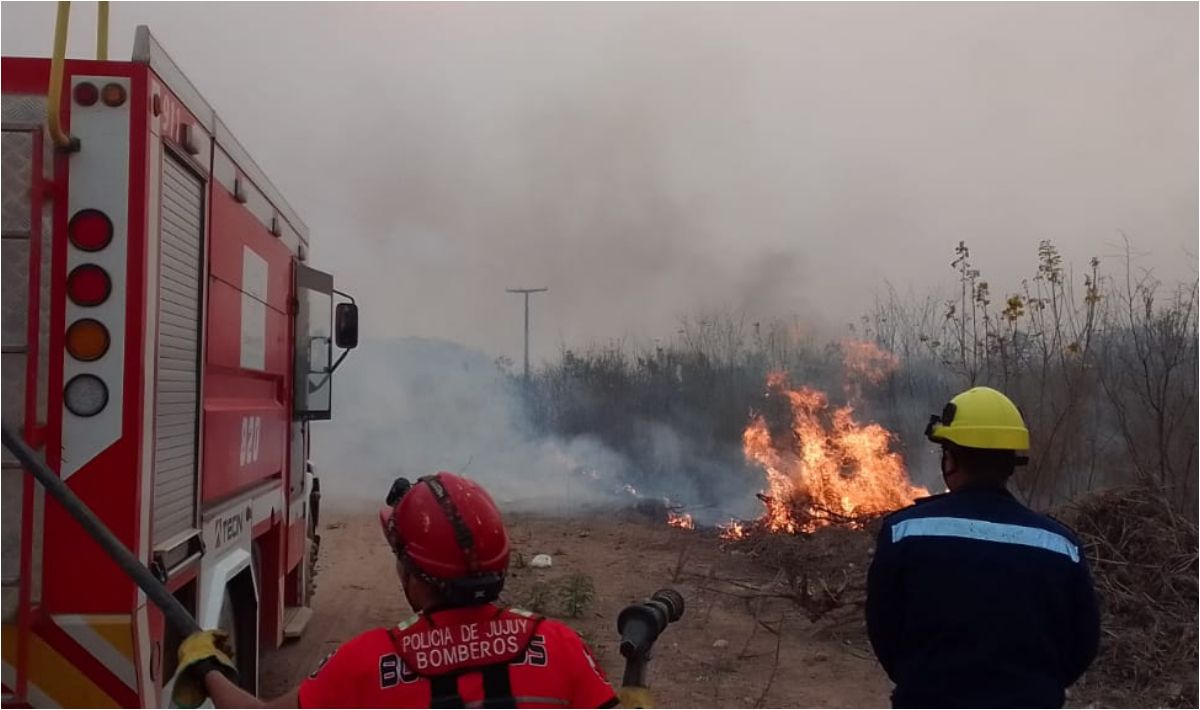 Bomberos de Fraile Pintado, conjuntamente con brigadistas de incendios forestales de distintas localidades trabajan para extinguir el incendio de pastizales por monte adentro en Yuto.